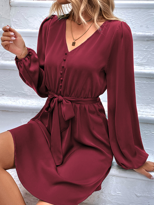 Women's Solid Color V-neck Button Waist Tie Maxi Dress