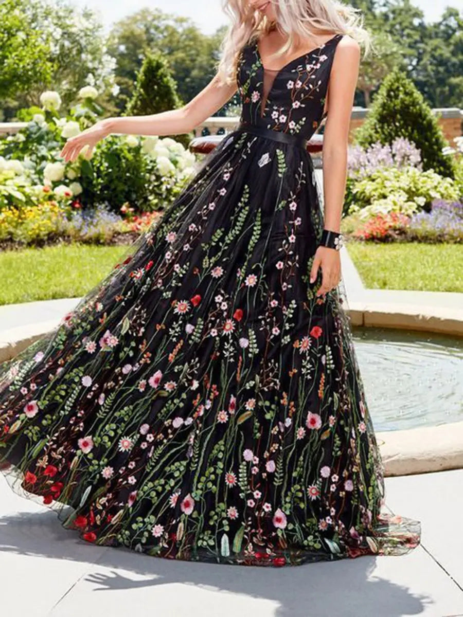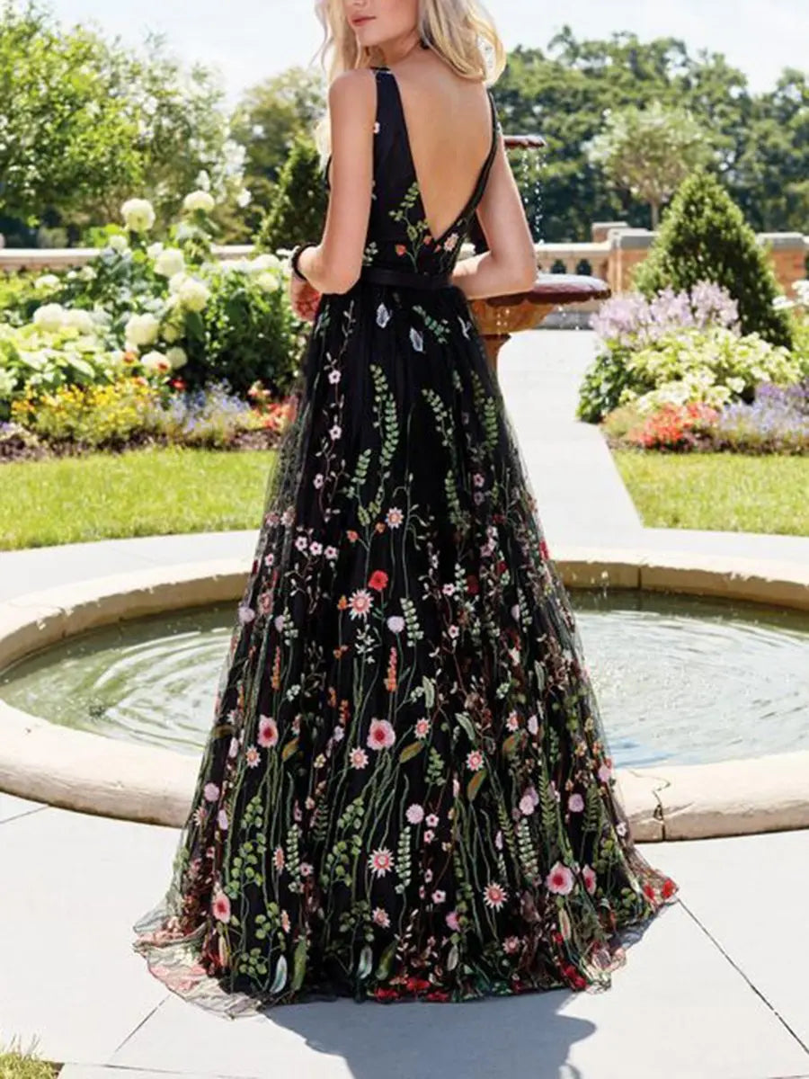Black V Neck Sleeveless Embroidered Prom Dress
