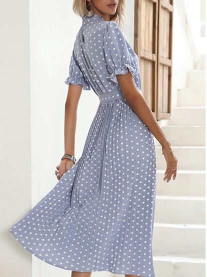 Mid Length Short Sleeve Polka Dot Round Neck Tie Pleated Dress