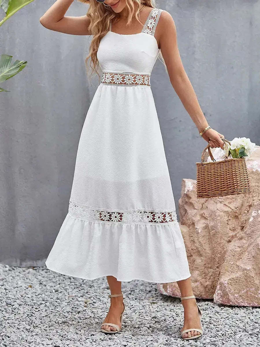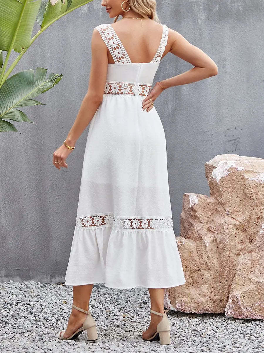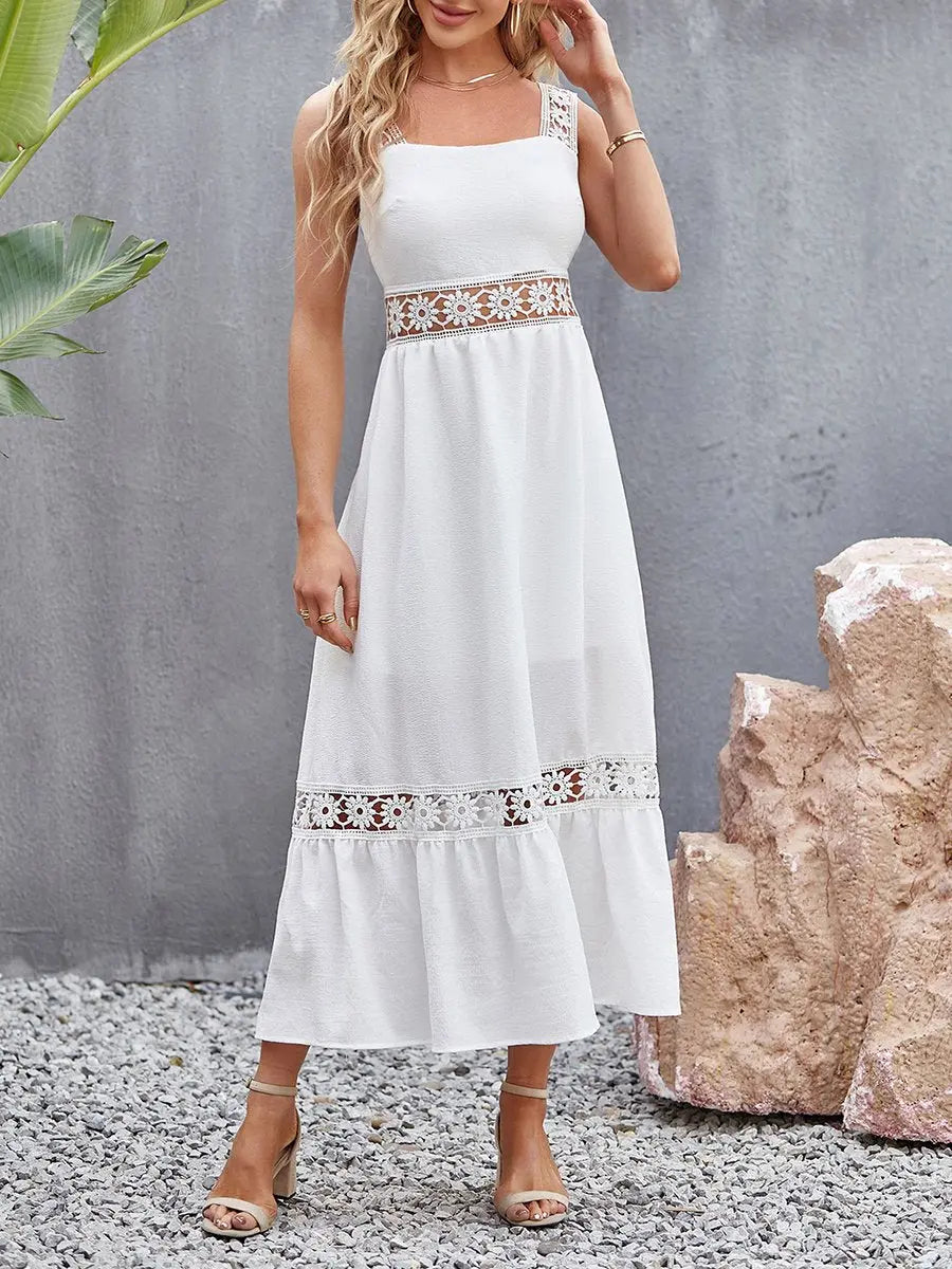 Summer Hollow Lace Panel Square Neck Slip Dress