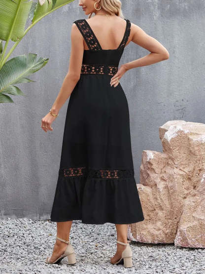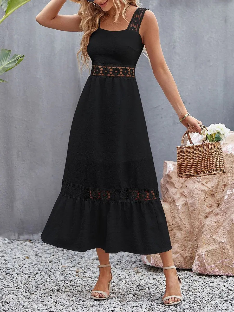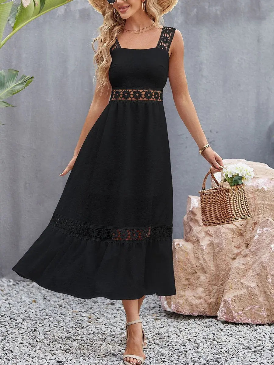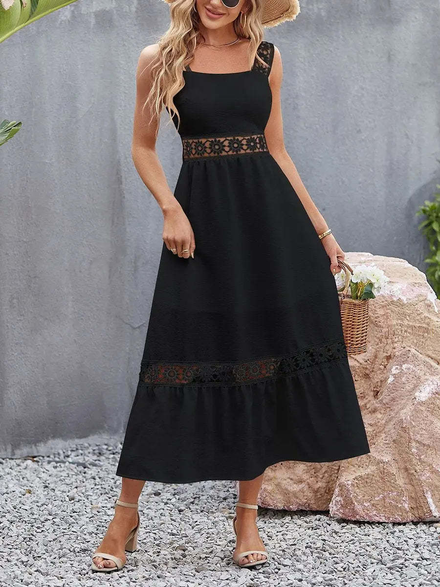 Summer Hollow Lace Panel Square Neck Slip Dress