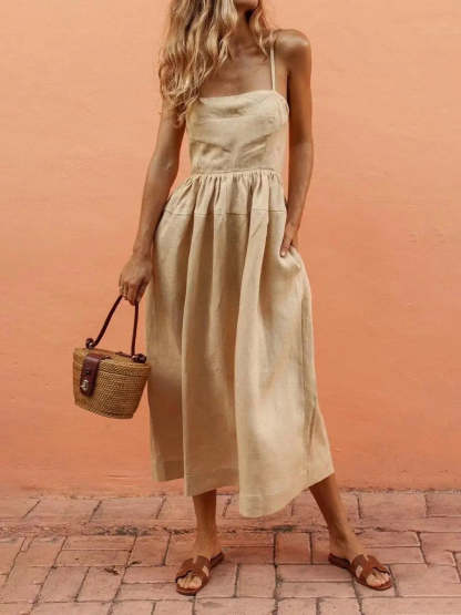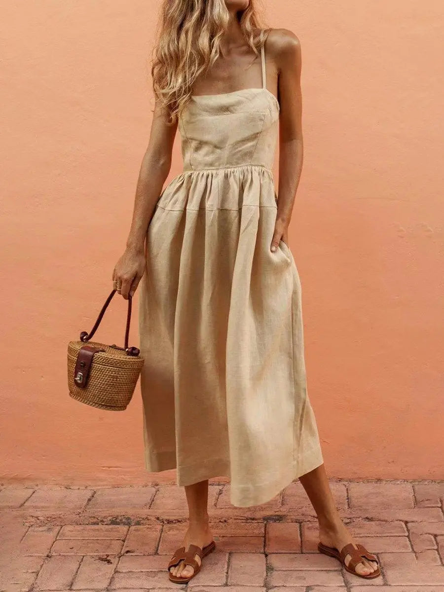 Summer Linen Cami Pleated Midi Dress