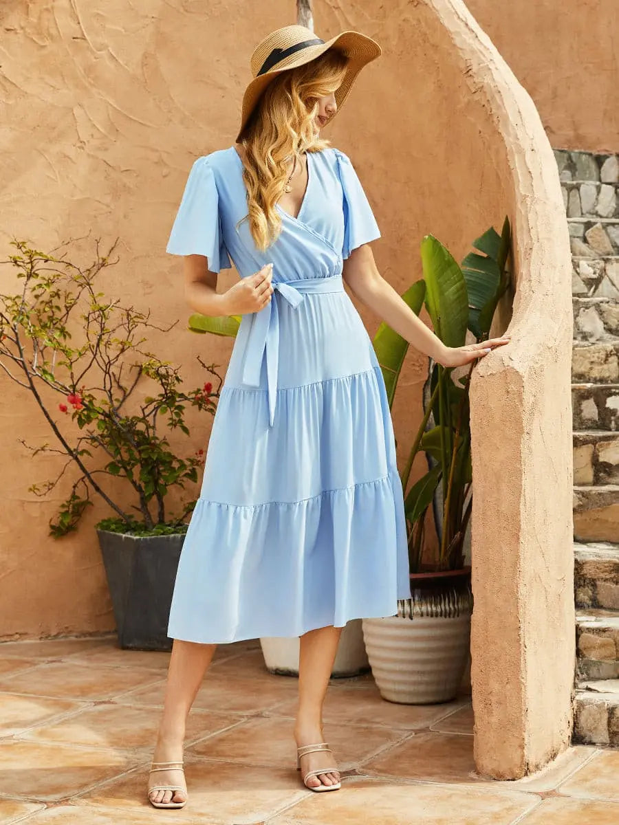 V-Neck Belted Butterfly Sleeve Dress