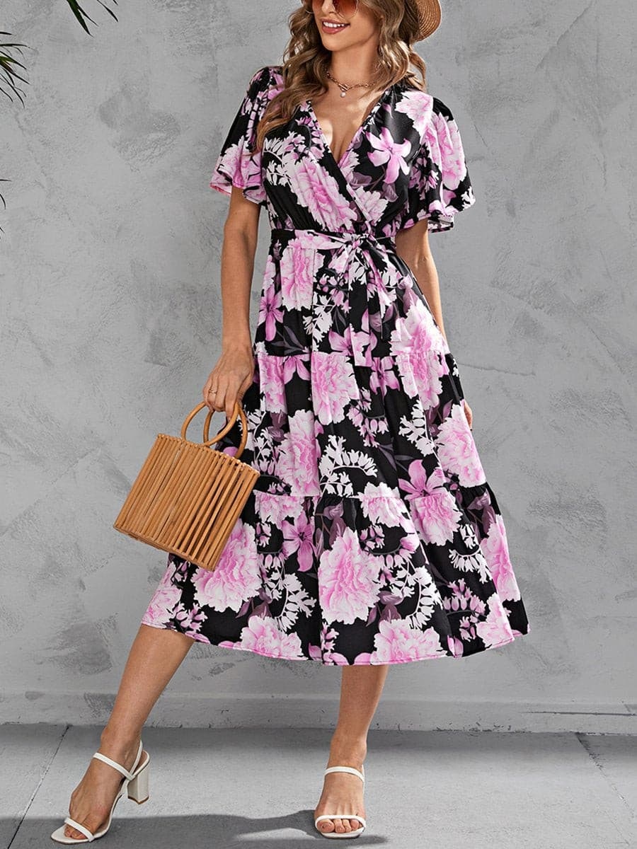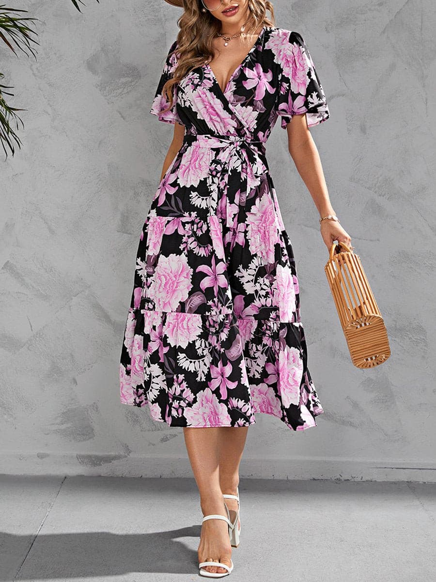 V-Neck Floral Pattern Belted Dress