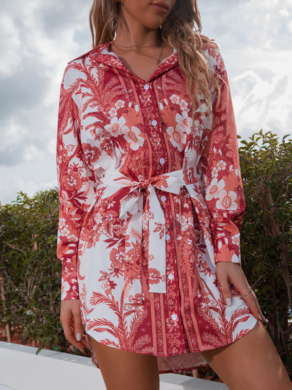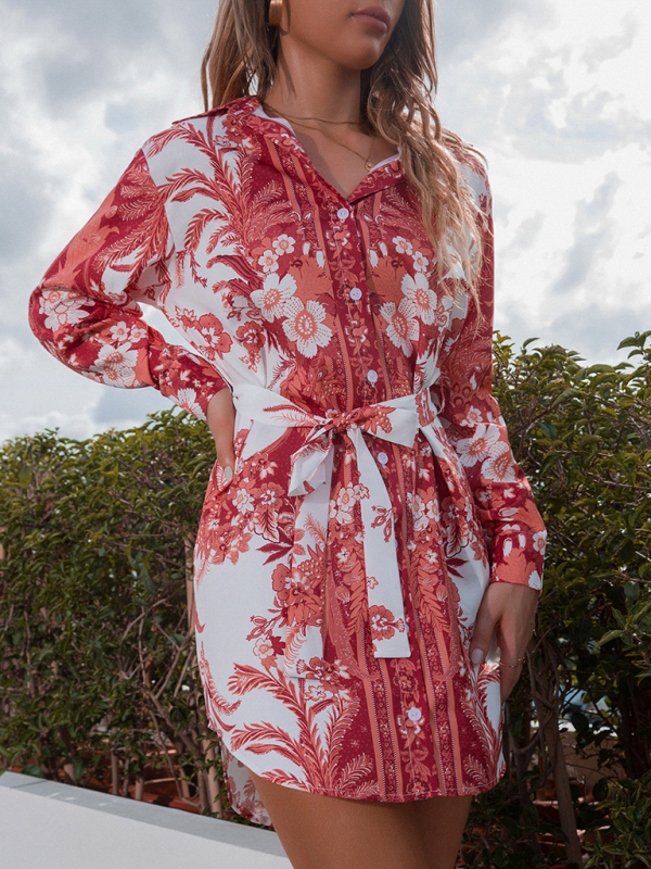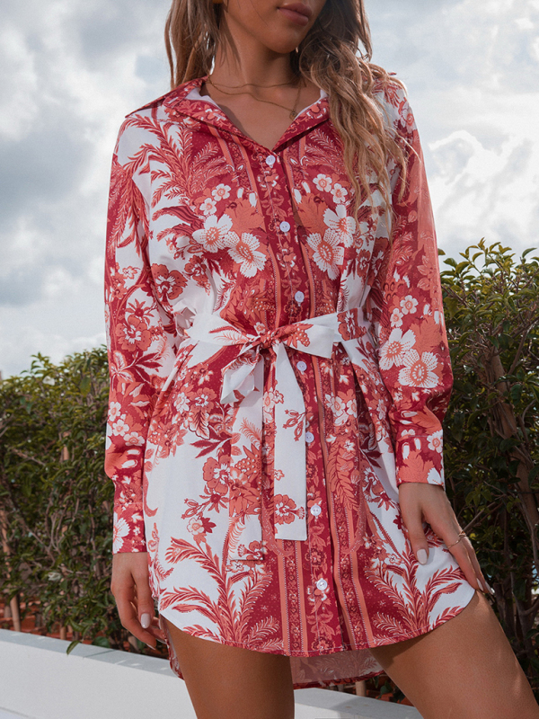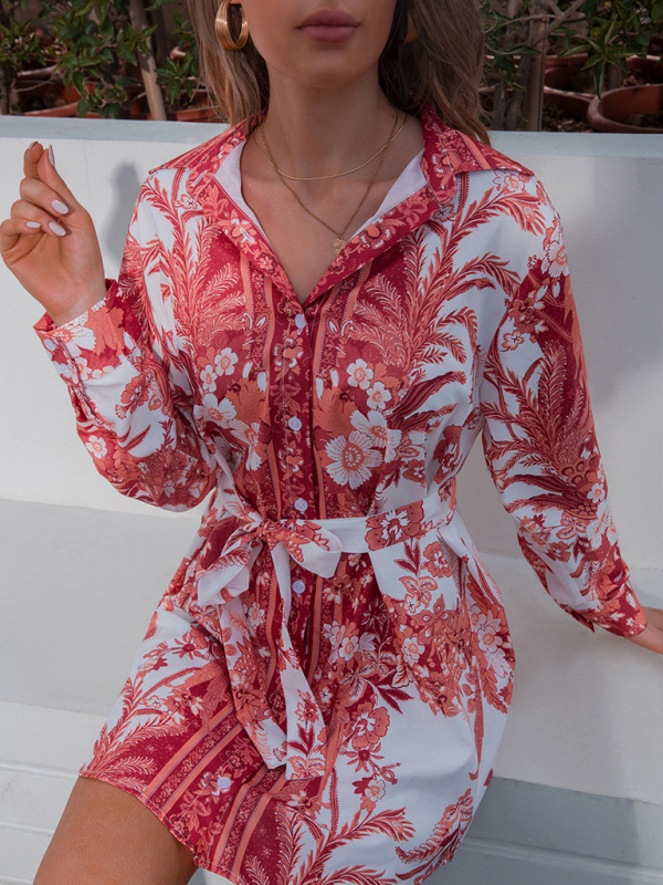 Woman's New Lapel Multicolor Print Tie Bow Long Sleeve Dress