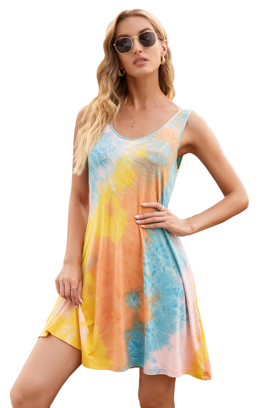 Women's Sleeveless Crewneck Pocket Tie Dye Print Tank Top Dress