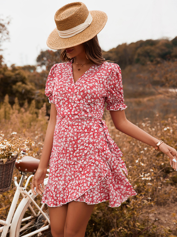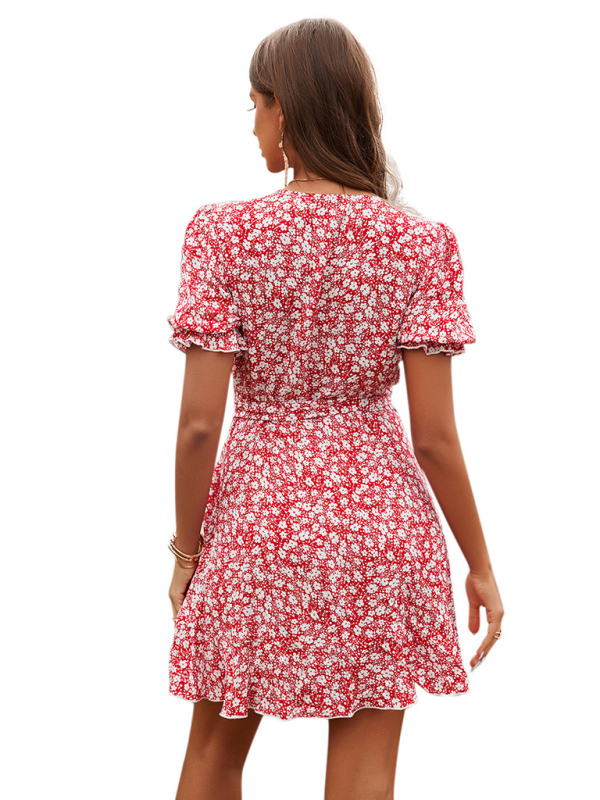 Women's V-neck short-sleeved high waist strap printed dress